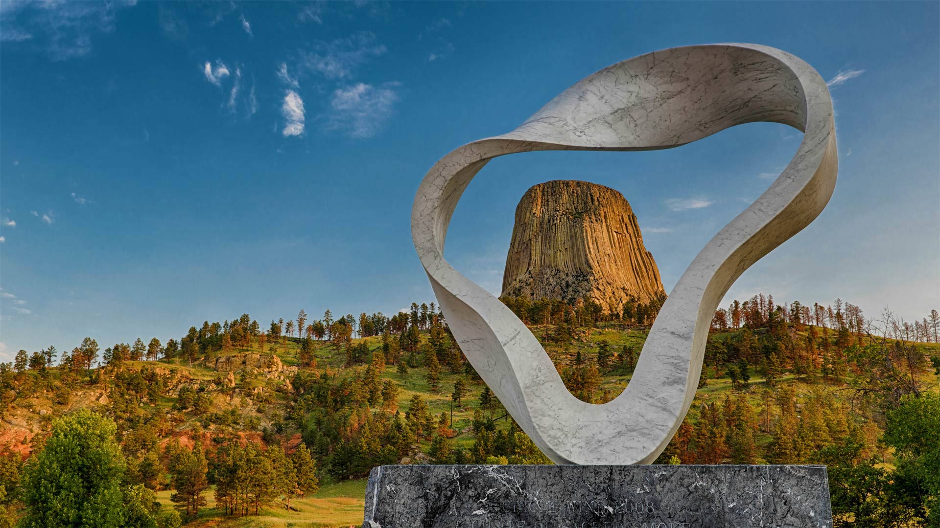 The 'Circle of Sacred Smoke' sculpture by Junkyu Muto frames Devils Tower in Wyoming (© Nagel Photography/Shutterstock)